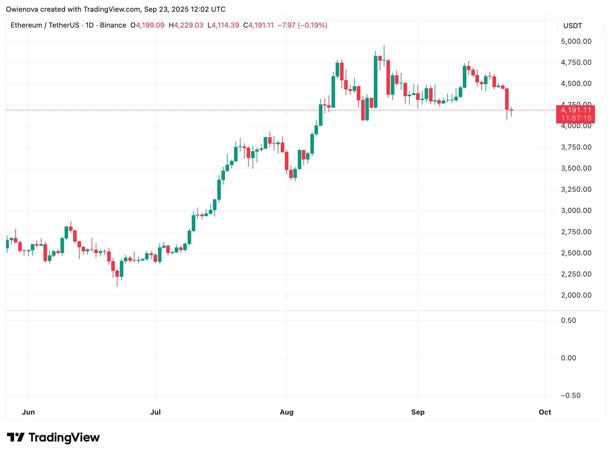 然而,Crypto Candy 也警告了一个关键风险。如果以太坊未能守住这一支撑位并收于 3,800 美元以下,整个前景可能会发生巨大转变。此举将使看涨结构失效,并可能引发强劲的抛售压力,从而为更深层次的回调打开大门。因此,未来几个交易日仍然至关重要,因为 ETH 需要努力守住这一关键支撑位。