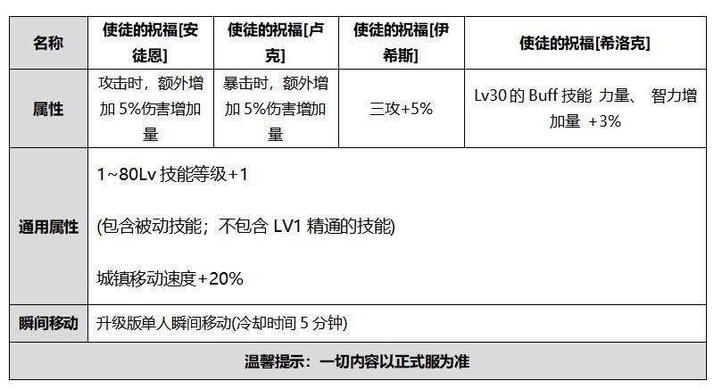 DNF使徒的祝福伊希斯属性三攻+5%,1~80Lv技能等级+1(包含被动技能;不包含LV1精通的技能);城镇移动速度+20%;瞬间移动:升级版单人瞬间移动(冷却时间5分钟)。