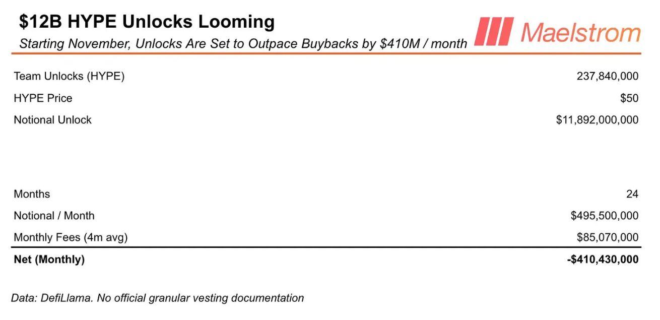 2025 年 11 月下旬,Hyperliquid 将开始在 24 个月内以线性方式解锁 2.378 亿枚 HYPE 代币。若按每枚代币 50 美元计算,这意味着团队解锁的代币总价值高达 119 亿美元,相当于每月将有近 5 亿美元的名义价值流入市场。目前,没有任何回购机制能够消化如此庞大的抛售压力。