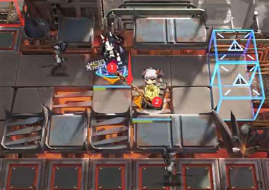 这一关有<接驳地块>地形,所以如下图所示先部署煌(向下)在部署塞雷亚即可。