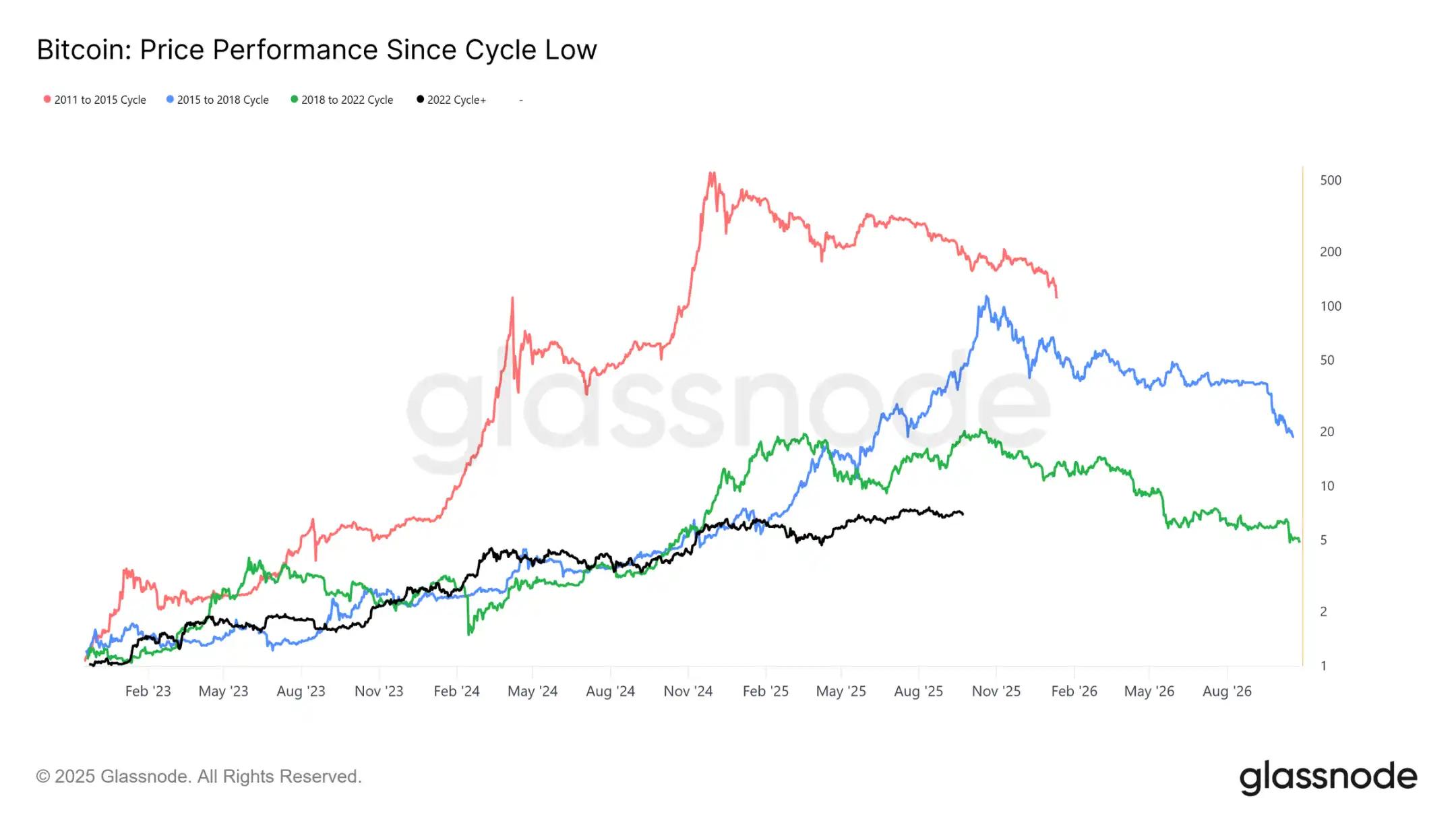 叠加过去四个周期可以看出,即使当前轨迹与前两个周期紧密吻合,峰值回报率也已随时间推移而减弱。假设 12.4 万美元标志着全球顶部,那么本周期已持续约 1030 天,非常接近前两个周期约 1060 天的长度。