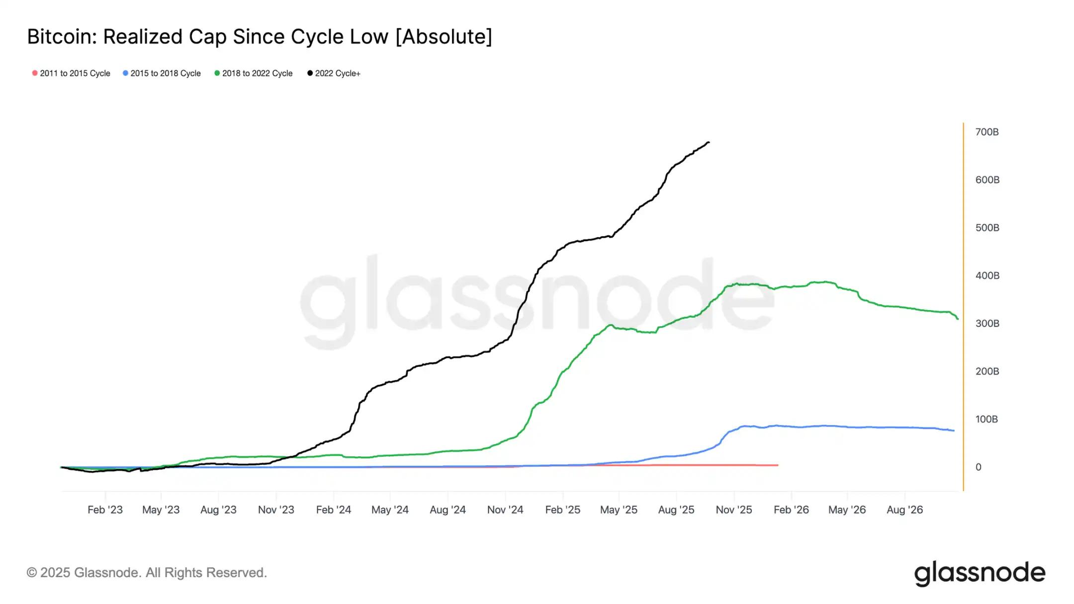 已实现市值自 2022 年 11 月以来已出现三波上涨。将总额提升至 1.06 万亿美元,反映了支撑本周期流入资金的规模。