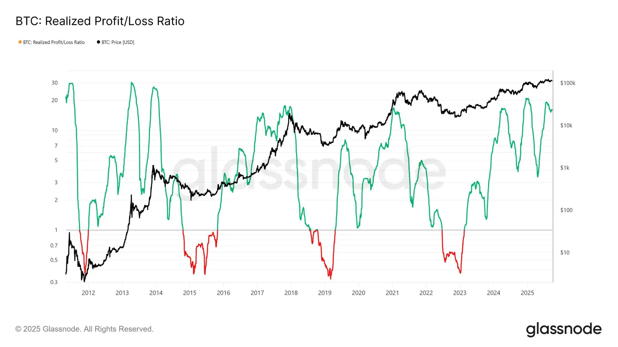 另一个不同之处在于流入结构。与早期周期单一的浪潮不同,本周期出现了三次明显的、持续数月的激增。已实现盈亏比率显示,每次利润实现超过移动代币的 90% 时,都标志着周期性峰值。刚刚脱离第三次此类极端情况后,概率倾向于接下来将出现降温阶段。