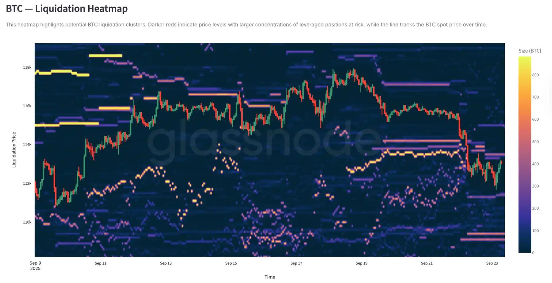 永续合约清算热力图提供了更多细节。当价格跌破 11.4 万至 11.2 万美元区间时,密集的杠杆多头集群被清除,导致大量清算并加速下行。风险口袋仍存在于 11.7 万美元上方,使得市场双向都容易受到流动性驱动波动的影响。在没有更强需求的情况下,这些水平附近的脆弱性增加了进一步剧烈波动的风险。