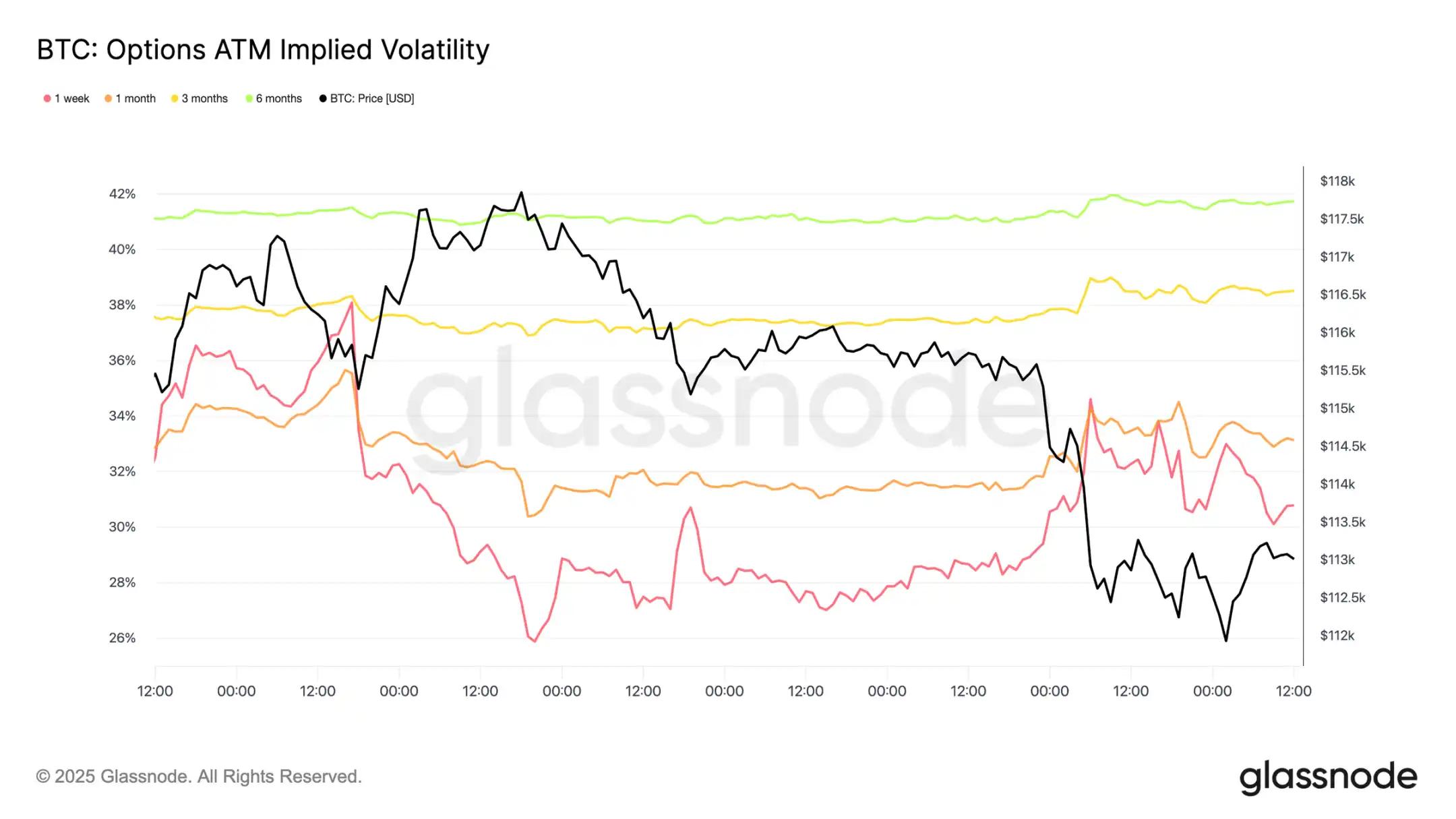 转向期权市场,隐含波动率为交易员如何度过动荡的一周提供了清晰的视角。两个主要催化剂塑造了市场格局:今年首次降息和自 2021 年以来最大的清算事件。随着对冲需求的建立,波动率在 FOMC 会议前攀升,但在降息确认后迅速消退,表明此举在很大程度上已被定价。然而,周日晚上期货的剧烈清算重新点燃了对保护的需求,一周期隐含波动率引领反弹,且强势延伸至各个期限。