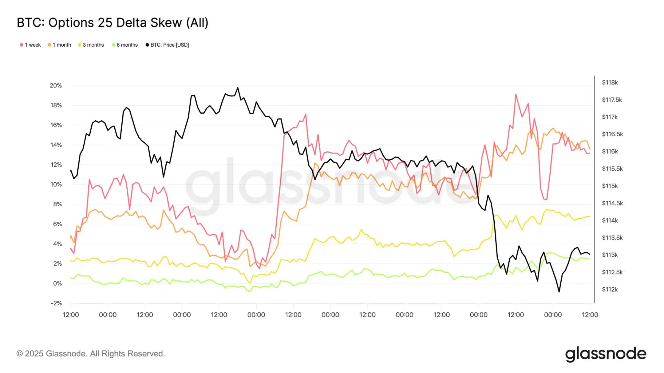 抛售之后,看跌 / 看涨期权成交量比率呈下降趋势,因为交易员锁定了价内看跌期权的利润,而其他交易员则轮动到更便宜的看涨期权。短期和中期期权仍然严重倾向于看跌期权,使得下行保护相对于上行而言成本高昂。对于对年底持建设性观点的参与者来说,这种不平衡创造了机会——要么以相对较低的成本积累看涨期权,要么通过卖出价格高昂的下行风险暴露来为其融资。