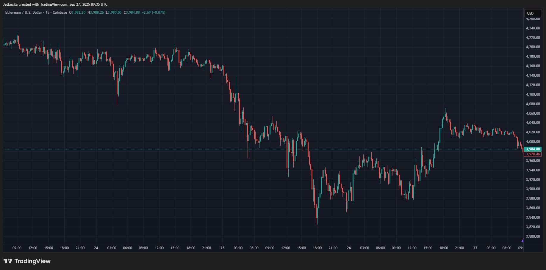 当鲸鱼再次出现时,以太坊的价格承受着巨大的压力。根据市场数据,ETH 今日跌至 3,829 美元,创下自 8 月以来的最低水平。