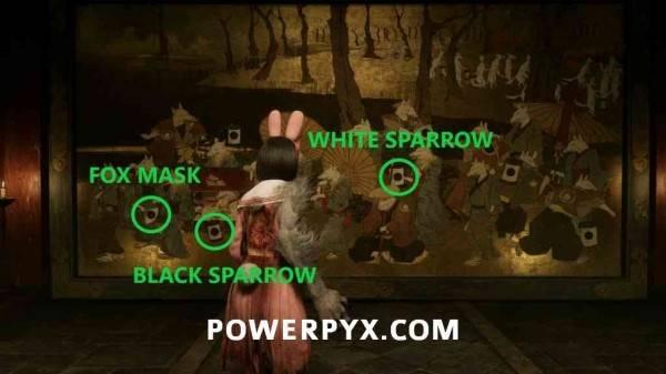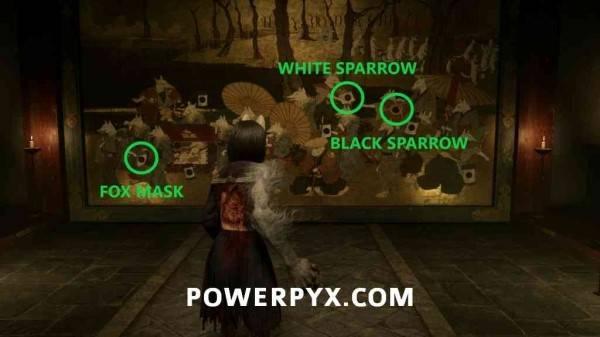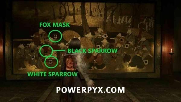 黑雀纹章放入狐面纹章右侧的空位,图案是红箱子下方的灯笼。