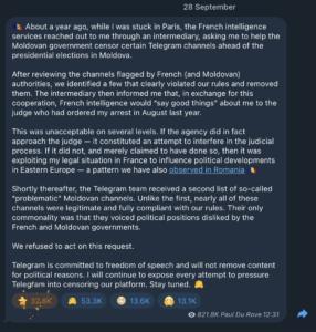 Telegram 创始人声称法国情报部门试图利用有利的法院影响力来换取摩尔多瓦的选举审查