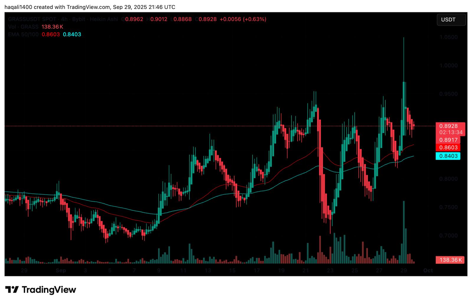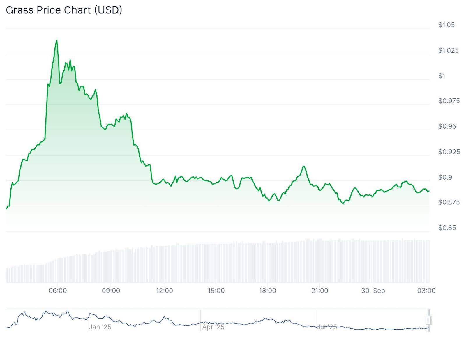 与此同时,GRASS 的价格在 0.89 美元到 0.90 美元之间徘徊。账面上看,每日涨跌幅度不大,但该代币曾从 0.864 美元飙升至 1.04 美元,随后回落。交易量较前一日增长 190%,达到约 8300 万美元。