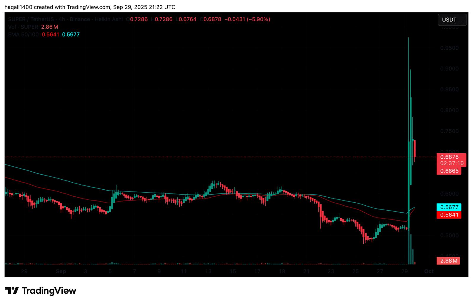 交易量低迷,价格在 0.45 美元至 0.55 美元之间徘徊。这种情况在 9 月 29 日发生了变化,SUPER 的一根爆炸性蜡烛在几个小时内突破了 0.95 美元,这是近几个月来最显著的盘中走势之一。