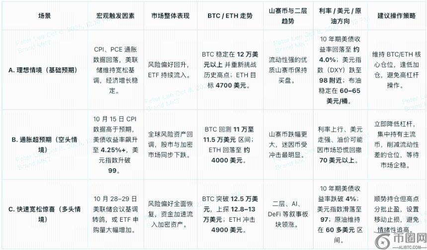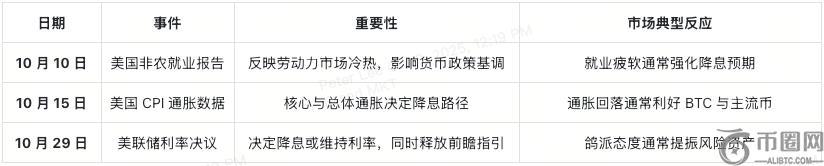 - 本月最重要的宏观事件是10 月 15 日的美国 CPI 通胀数据和10 月 28–29 日的美联储会议,这两项将决定全球市场的流动性与情绪走向。