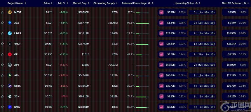 - Linea (LINEA):10 月 10 日解锁约10.8 亿枚代币(约 2900 万美元,占流通量约 6–7%)。