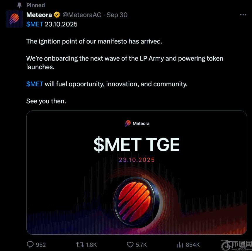 – Meteora (MET):10 月 23 日将在 Solana 上举行 TGE,初始解锁约48%流通代币,其余将在未来6 年线性释放。