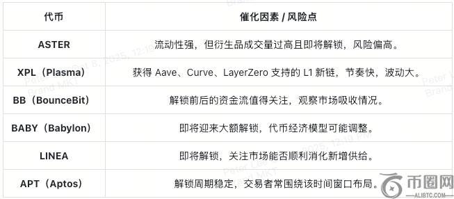 - Linea、Aptos、Aethir、BounceBit、Starknet 和 Babylon等项目将在本月陆续解锁代币,可能带来短期供给压力。提前了解具体解锁日期,有助于你规避波动风险。