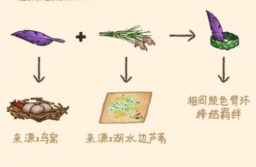 原始家族(家族中的第一个人)决定了家族的名称。游戏中一共三种颜色的羽毛,用什么颜色的羽毛都可以,但是佩戴者一定要相互靠近并同时戴上相同颜色的誓约臂环缔结羁绊。下面给大家带来了村落人生誓约臂环制作方式,不清楚怎么制作的可以看看!
