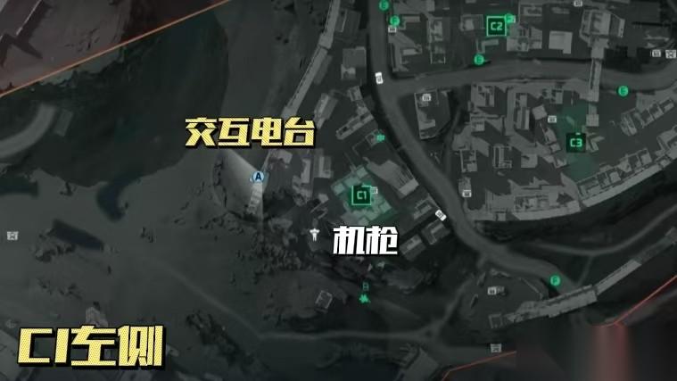 兔桑已经提醒大家能否率先触发4个电台锁定彩蛋任务是一切的基础也是重中之重,所以我们必须是哈夫克阵营(防守方),可以先从中央区域B和C与其中的电台交互;时间紧任务重,我们先来看C1区域左侧这个点位——这个点位是在地图的边缘并且需要我们走出地图才能找到,当然走出地图十秒钟就会自动阵亡,所以我们要规划好路线快速找到电台;来到C1之后可以根据地图找到乱石堆上的机枪,之后向地图的的左方向奔跑到一个断裂的墙壁处,开始绕着攀爬(此时已经提醒”返回战场“)看到三颗树之后旁边墙壁拐角处就能找到这个电台了(此时进行交互是不会提醒”返回战场“的)。
