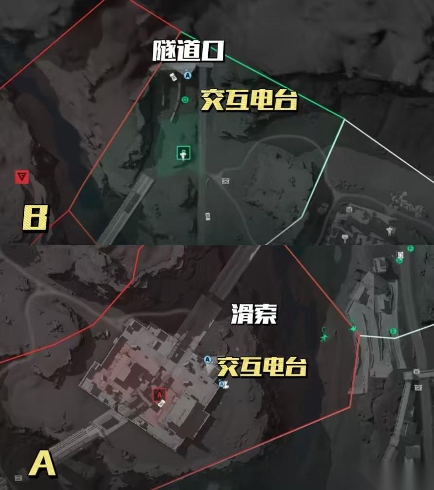 B区域的电台点位非常容易找到,来到地图最上方的隧道口的右侧角落就能找到;A区域的电台需要我们来到悬崖边缘,找到滑索并滑下去进入山洞——此时我们只需要一直走看到一个非常突兀的集装箱和铁网布置的区域,在内部一个比较矮的集装箱上就能找到电台进行交互了。