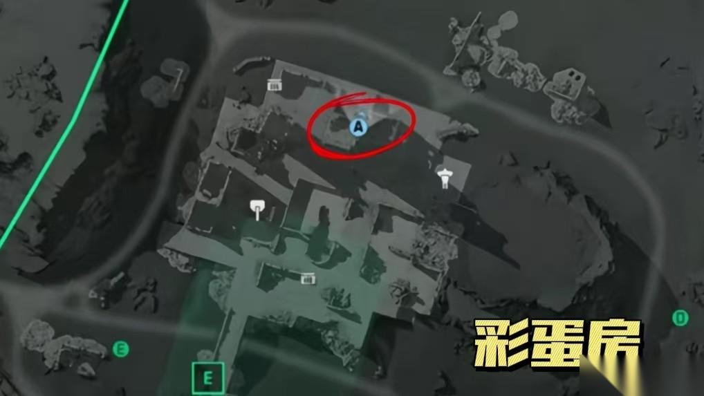 E区域右下点位就在高耸的城墙连接拐角处(周边是一片草地过渡到一片荒地),很多彦祖可能来到这因为比较昏暗没法第一时间找到电台;F区域点位就在靠近小路一侧的房间中,还算是比较好找到的。