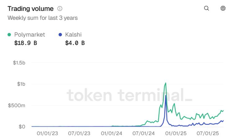 tokentermina 最新数据显示,其总成交额已升至 189 亿美元,大幅领先于另一个竞争对手 Kalshi。