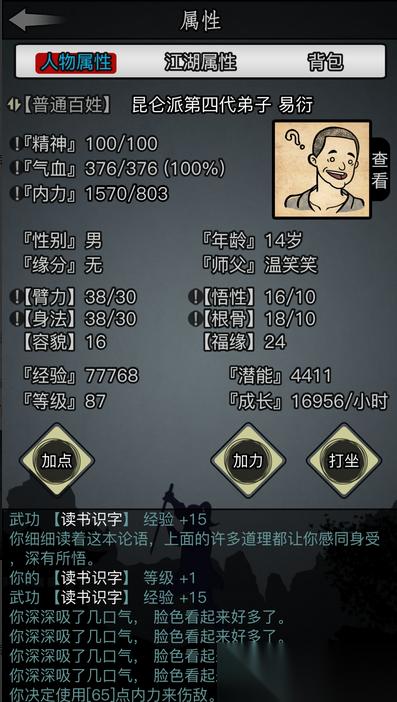 悟性(脑子好):决定你请教师父消耗的潜能多少!悟性越高,潜能省得越多,练功像坐火箭!