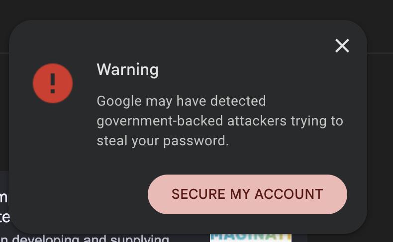我偶尔会收到谷歌的这个警告。有人知道这是什么吗?朝鲜拉撒路?我的账户里虽然没什么重要信息,但还是要保持安全。