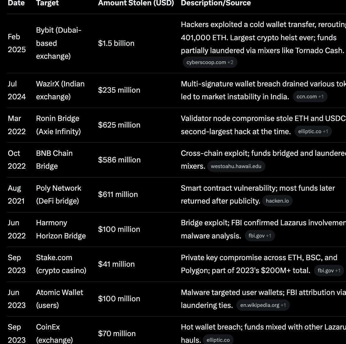 - 朝鲜 Lazarus 集团发动的顶级加密货币攻击。资料:公开数据,由 Grok 汇编。