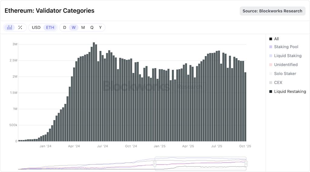 重新质押的以太币数量稳定在 200-300 万 ETH 之间,其中大部分是特征层| :Blockworks 研究(实体标签于沙丘的权益流向表。)