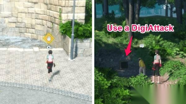 2.与母亲交谈后,与标记的斑点互动以寻找痕迹。然后,走楼梯前往社区森林,对空地上的盒子使用数码攻击。