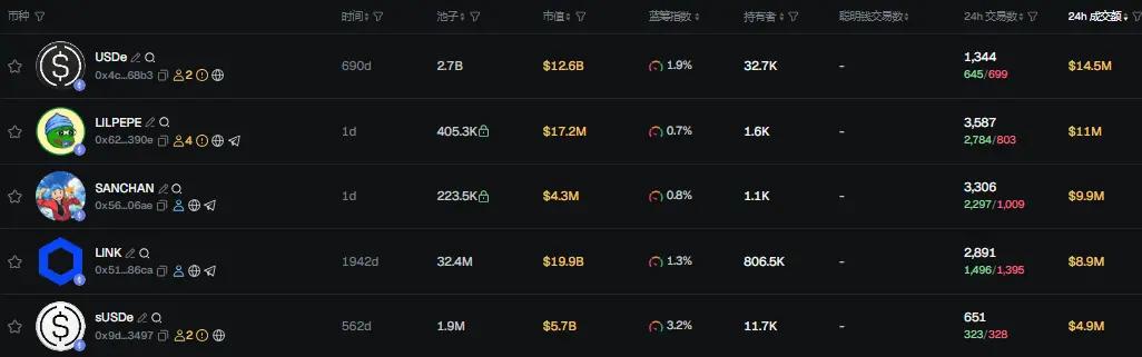 过去 24h ETH 热门代币前五依次为:USDe、LILPEPE、SANCHAN、LINK、sUSDe