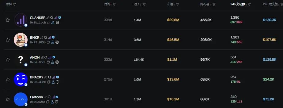 过去 24h Base 热门代币前五依次为:CLANKER、BNKR、ANON、BRACKY、Fartcoin