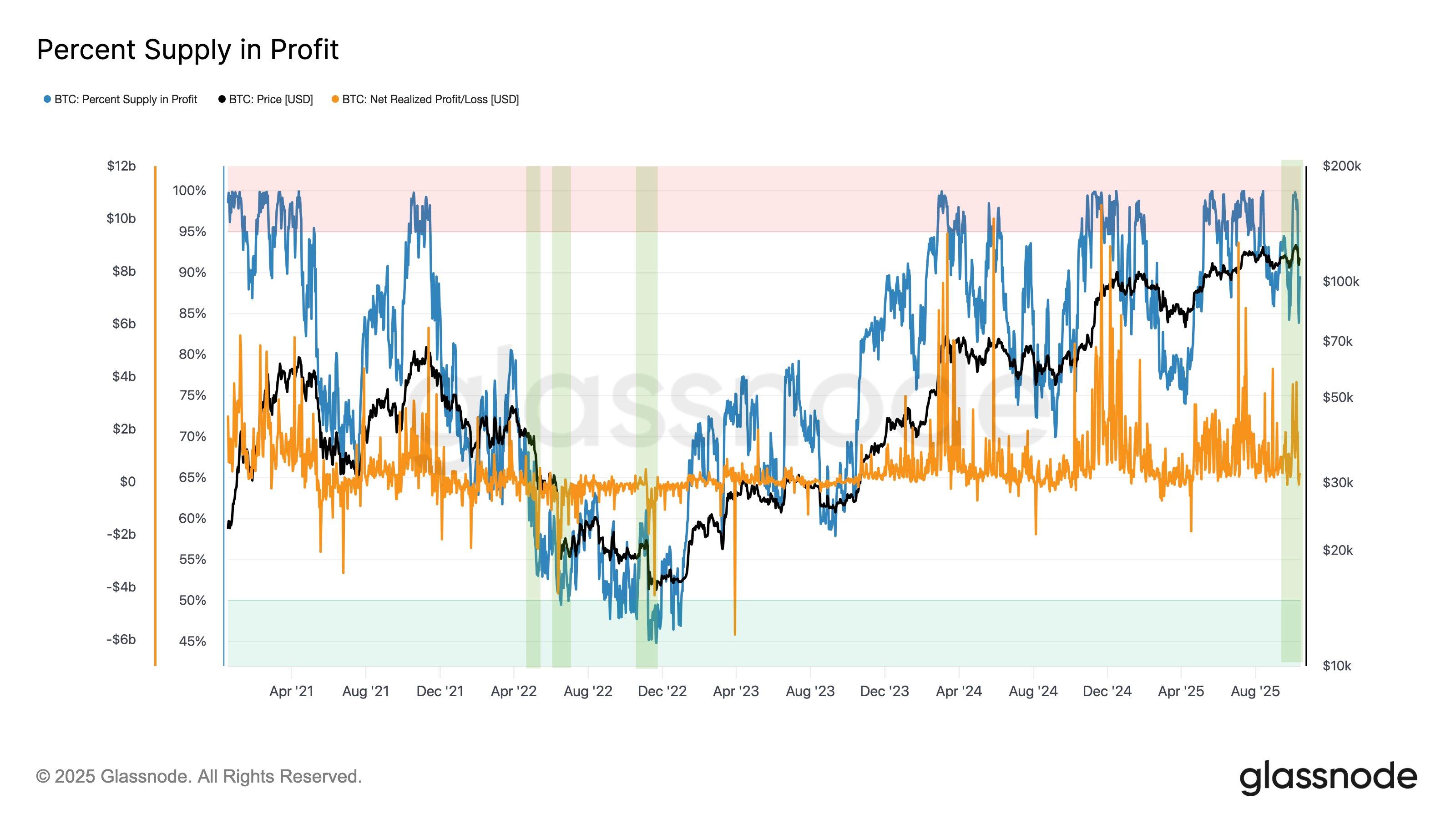 现在,这是 Glassnode 分享的图表,显示了过去几年比特币供应量利润百分比的趋势: