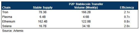 尽管Plasma以84.2亿美元的DeFi TVL位居第四,但它的核心特征应该是实用性,而不是存款功能。稳定币链的标志是活跃的流通量。每周P2P转账数据显示,Tron和Solana遥遥领先,每枚稳定币的流通量大约为每周两次。Plasma和以太坊则落后,这表明大多数稳定币要么被“闲置”在矿场,要么被闲置。