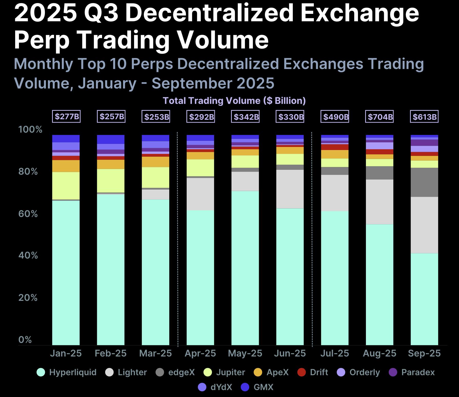 去中心化永续交易所(Perp DEX)也出现了惊人的增长,共处理了1.8万亿美元的交易,较第二季度增长了87%。虽然Hyperliquid仍占据超过一半的市场份额,但Aster、Lighter和edgeX等新兴平台正在迅速追赶。仅Aster一家,9月份的日交易量就突破了848亿美元。