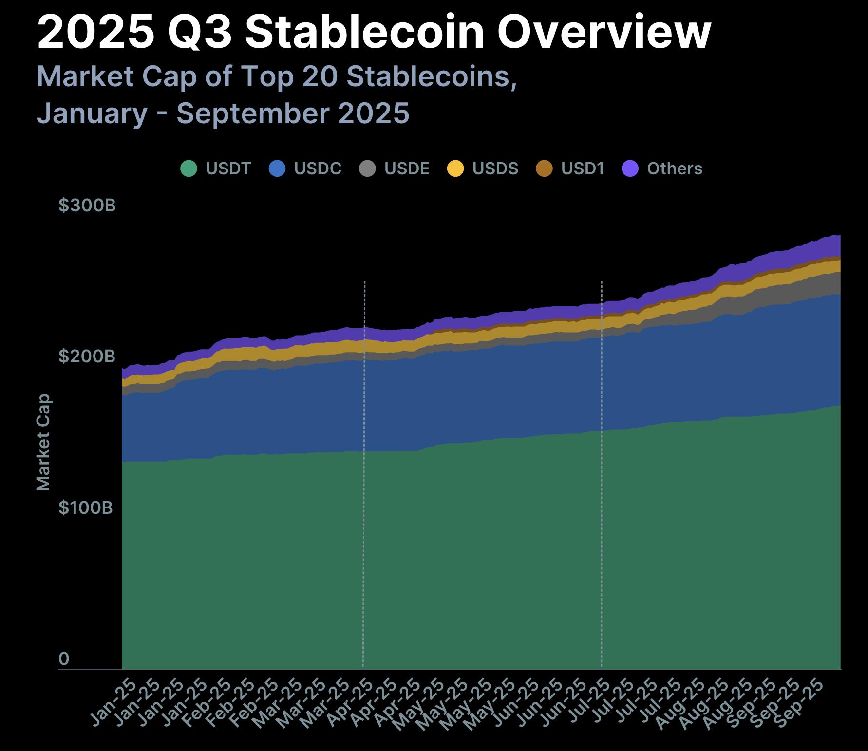 随着市场参与者在交易活动增多的情况下寻求流动性锚,稳定币价格创下历史新高。该行业总市值在第三季度攀升18.3%,达到创纪录的2876亿美元,并在第四季度初短暂突破3000亿美元。