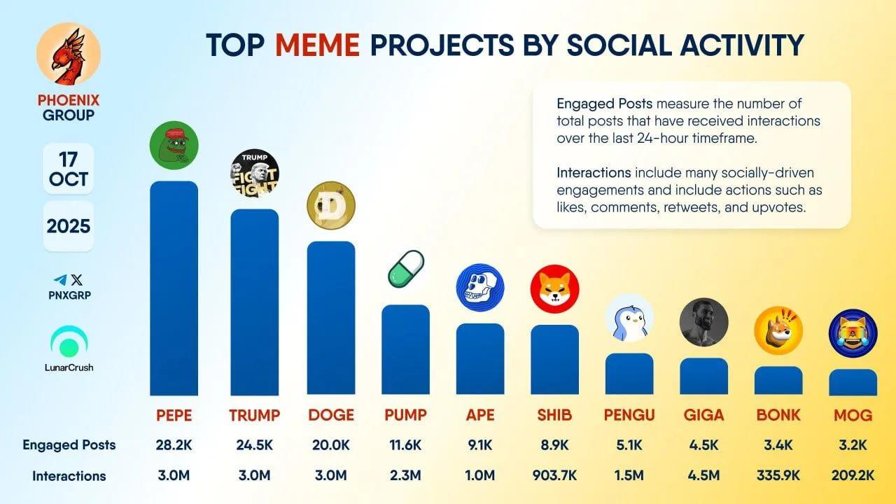 据Phoenix Group – Crypto News & Analytics报道,LunarCrush于2025年10月17日发布的数据显示,PEPE在社交活跃度方面领跑表情包币市场。过去24小时内,其活跃帖子数量达2.82万条,互动量超过300万次,稳居榜首。如此强劲的在线互动度凸显了PEPE活跃的社区以及在表情包币领域的持久影响力,即使在整体市场放缓的背景下亦是如此。