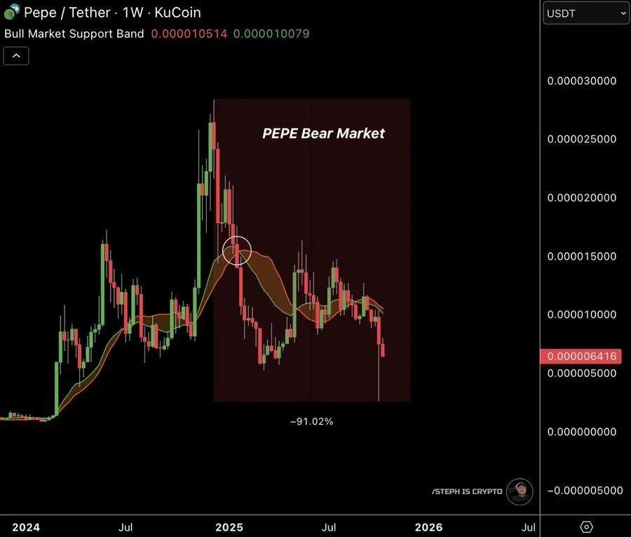 分析师 Steph_iscrypto 的最新数据显示显示PEPE 未能守住 0.000010514 美元至 0.000010079 美元之间的牛市支撑位,已正式进入熊市。跌破这一支撑位标志着明显的趋势逆转,导致其较峰值大幅下跌 91.02%。