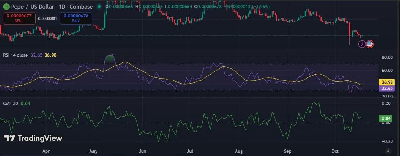 1日PEPE图显示,该代币在经历近期下跌趋势后,温和反弹约1.95%,交易价格接近0.00000678美元。价格似乎在关键支撑位0.00000660美元附近盘整,而即时阻力位在0.00000685美元附近。