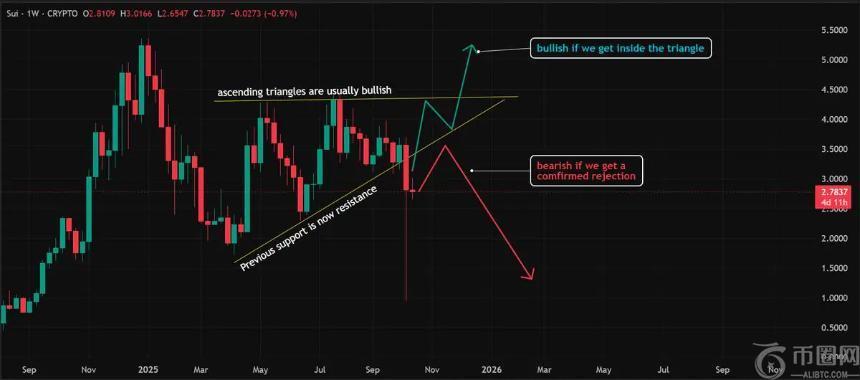 分析师Lark Davis指出,SUI在突破其上升三角形形态后出现大幅回调。如果能够重新收复趋势线支撑,则看涨格局有望恢复;否则,可能会进一步回调。