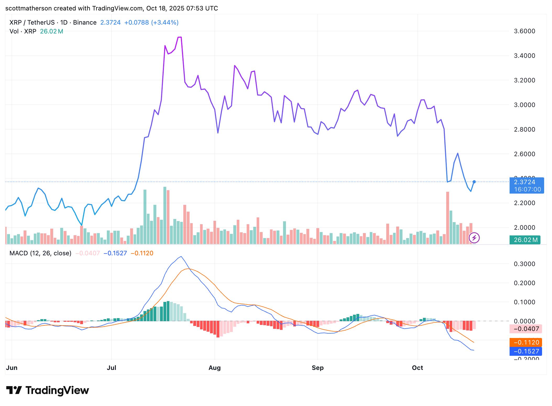 本次 XRP 价格预测正值该与整体加密市场同步下跌之际。受中美贸易紧张局势及其他宏观因素(如长期的贸易摩擦)的影响,XRP 目前交易价格略高于 2 美元的心理关口。美国政府关门也进一步加剧了市场的看跌情绪。