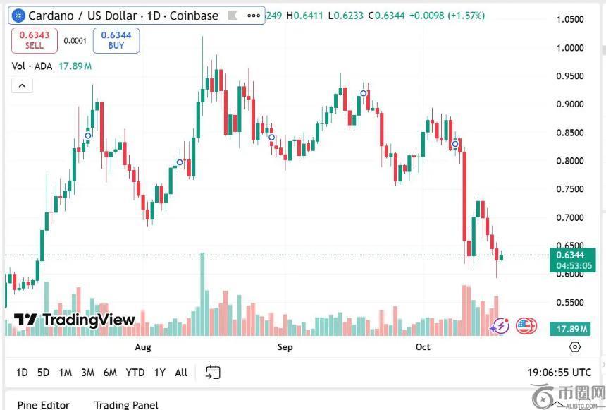 在这一背景下,Cardano凭借其强劲的开发活动和稳健的基本面表现尤为突出。目前,Cardano的价格为0.6343美元,过去24小时内上涨约4.5%,市值达到约228.4亿美元,成为1美元以下表现最佳的加密货币之一。