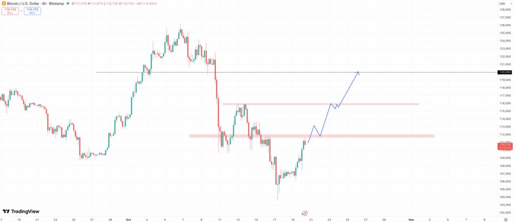 第一个阻力位是4小时图上112,000美元附近的小阻力位,多个烛线显示将面临强劲的抛售压力。如果能够彻底突破并确认突破该水平,则可能打开通往115,800美元的大门,一旦突破该水平,比特币距离120,000美元就近在咫尺了。