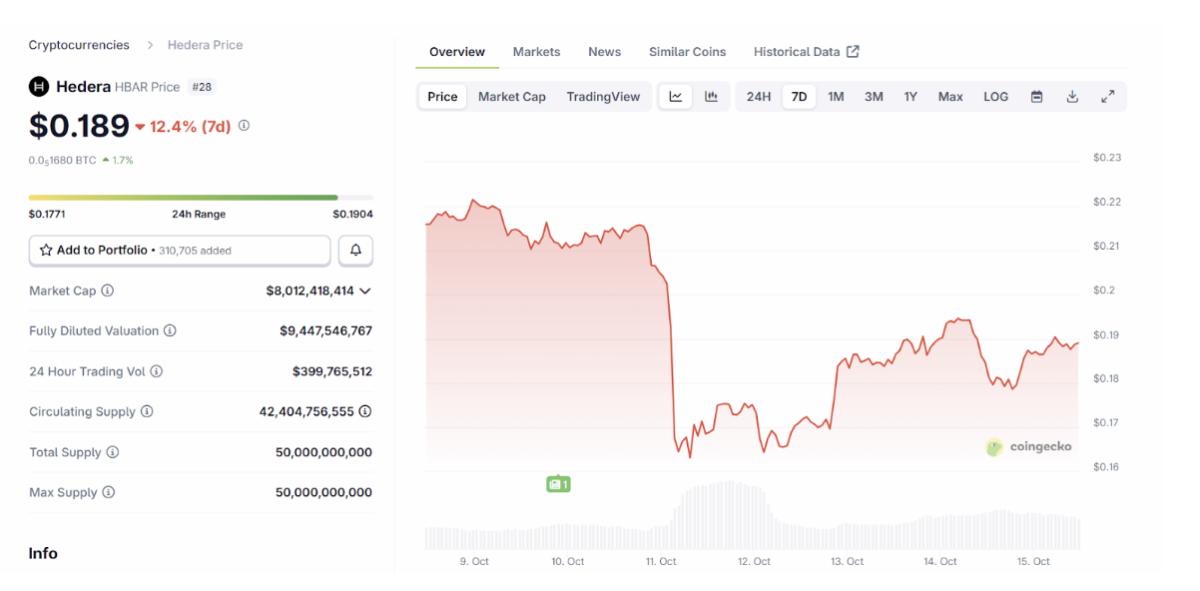 分析师认为,持续高于 0.22 美元的表现可能引发更明确的看涨模式。链上流动性也有所改善,反映出市场对 Hedera 治理和网络活动的信心有所恢复。目前对 10 月份 HBAR 的预测为 0.185 美元至 0.248 美元,维持在强劲的上行通道内。
