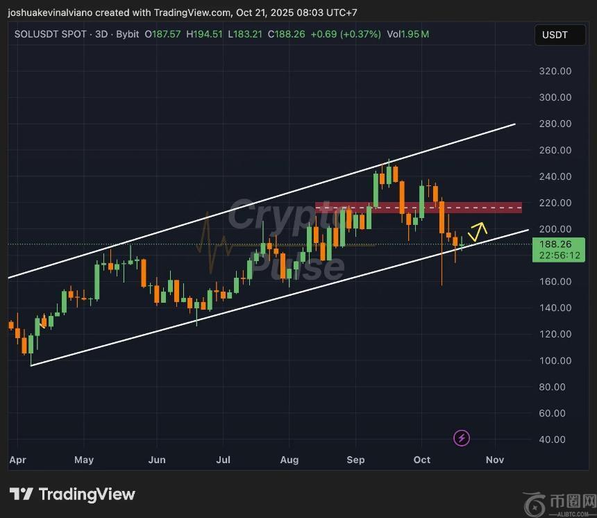 截至发稿时,Solana(SOL)的价格接近186.40 美元,过去 24 小时内下跌近 3%。分析平台 CryptoPulse 指出,SOL 正在重新测试其长期存在的 185 美元附近的上升趋势线,该趋势线曾多次提供强劲支撑。