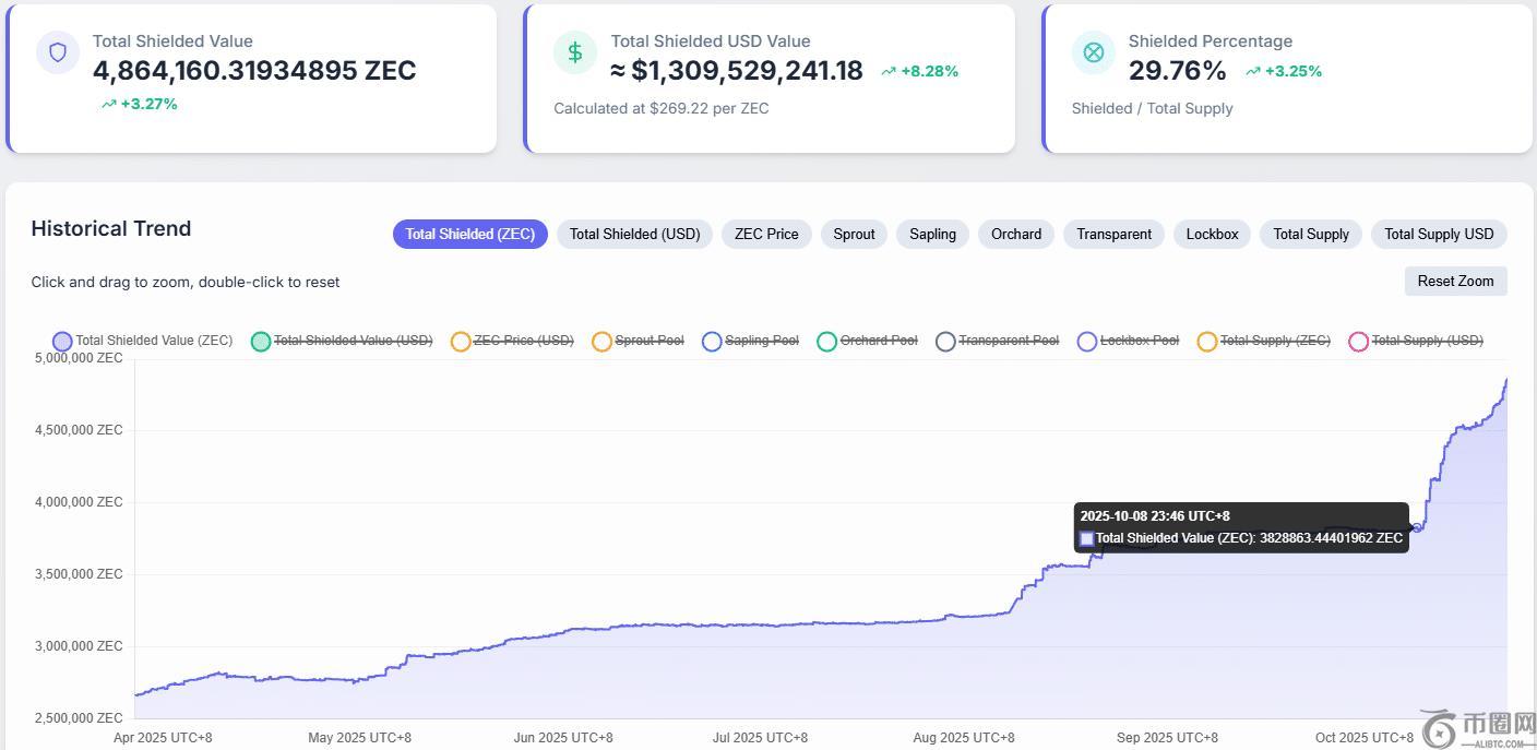 根据 ZCash 指标仪表板 zkp.baby 的数据,共有 486.4 万个 ZEC 被屏蔽。10 月 8 日,这一数字为 382 万个 ZEC。