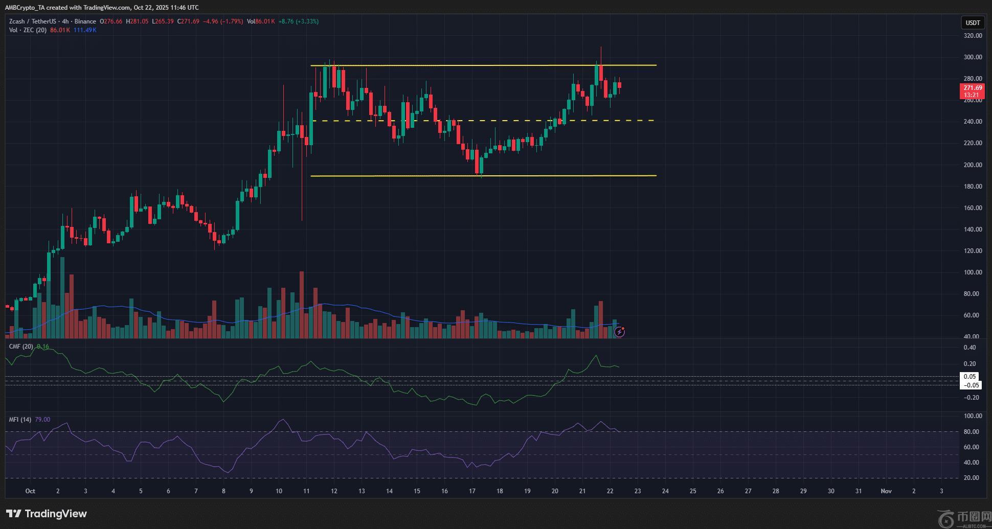 自9月22日起,ZEC已上涨 488%,从 46.2 美元涨至 271.68 美元。截至 2025 年第四季度,ZEC 已上涨 266%。