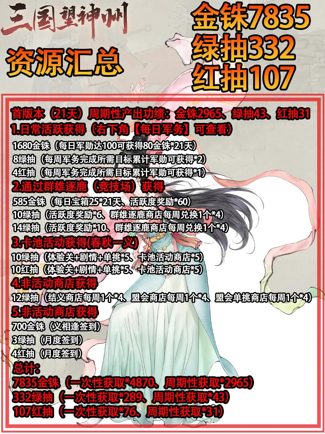 记录了公测第一个版本(21天)内的全部金铢+绿抽+红抽的获取方式!
