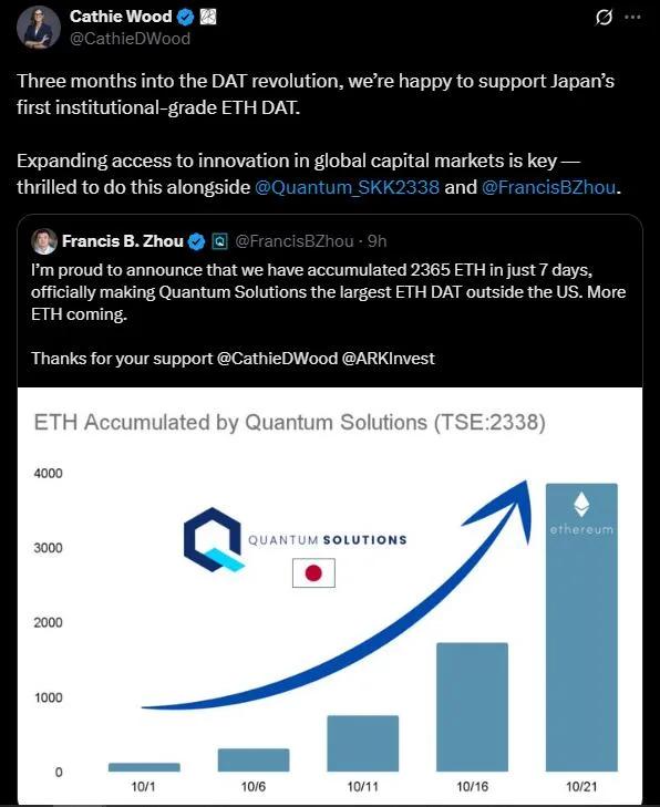 Wood 将 Quantum Solutions 描述为日本首个机构级以太坊数字资产库。她进一步提到,ARK Invest 很高兴能够支持该地区的此类创新。