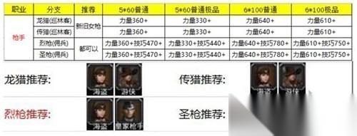 四、火枪手:初期不建议培养,后期资源充足时,并且抽到SS时,再来培养。 1、转职优先级:火枪手→巡林客→游侠→大游侠→狂野游侠→巨龙猎人。 2、转职第二级:火枪手→巡林客→游侠→大游侠→狂野游侠→传奇猎人。
