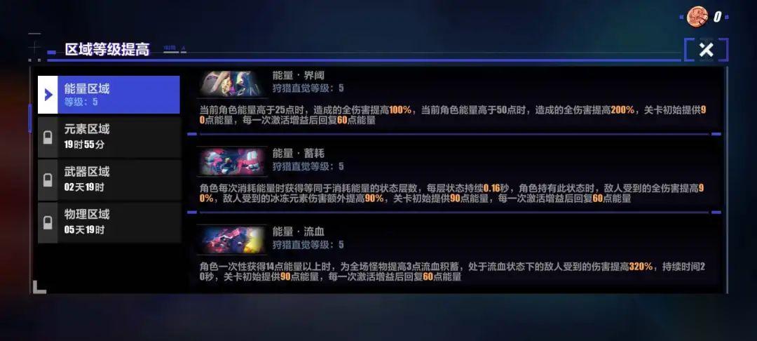 活动中需要玩家挑战4个主题,每个主题3小关的关卡,主题分别为能量、元素、武器、物理。根据每个关卡的主题,活动也会给出相对应的【狩猎直觉】和【增益】,关卡内会含有【增益】的图鉴,基本上由1金4紫5蓝组成。关卡内可选6次,相同的可以升级。详细内容可以在单区域内详细介绍。